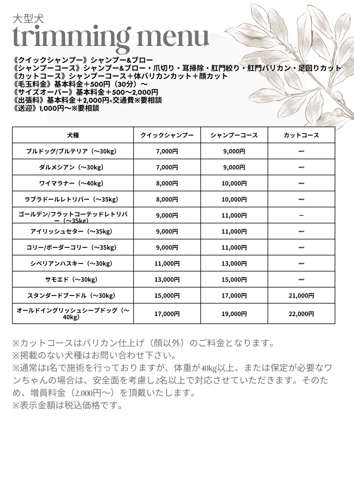 大型犬 1,000円割引(小型・中型犬とペアでご予約の場合、1頭につき500円割引)